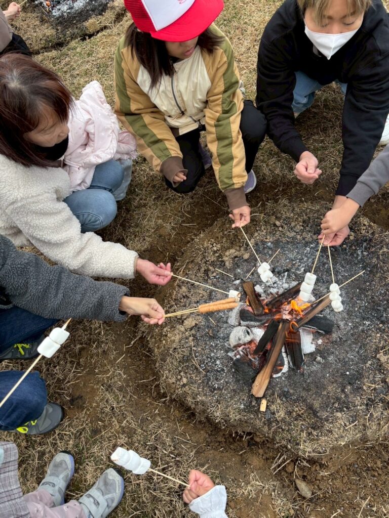 焼き上がりを待つ間は、焚き火を囲んでマシュマロ串やウインナー串を焼いたり、子どもたちの笑顔があふれる時間となりました✨